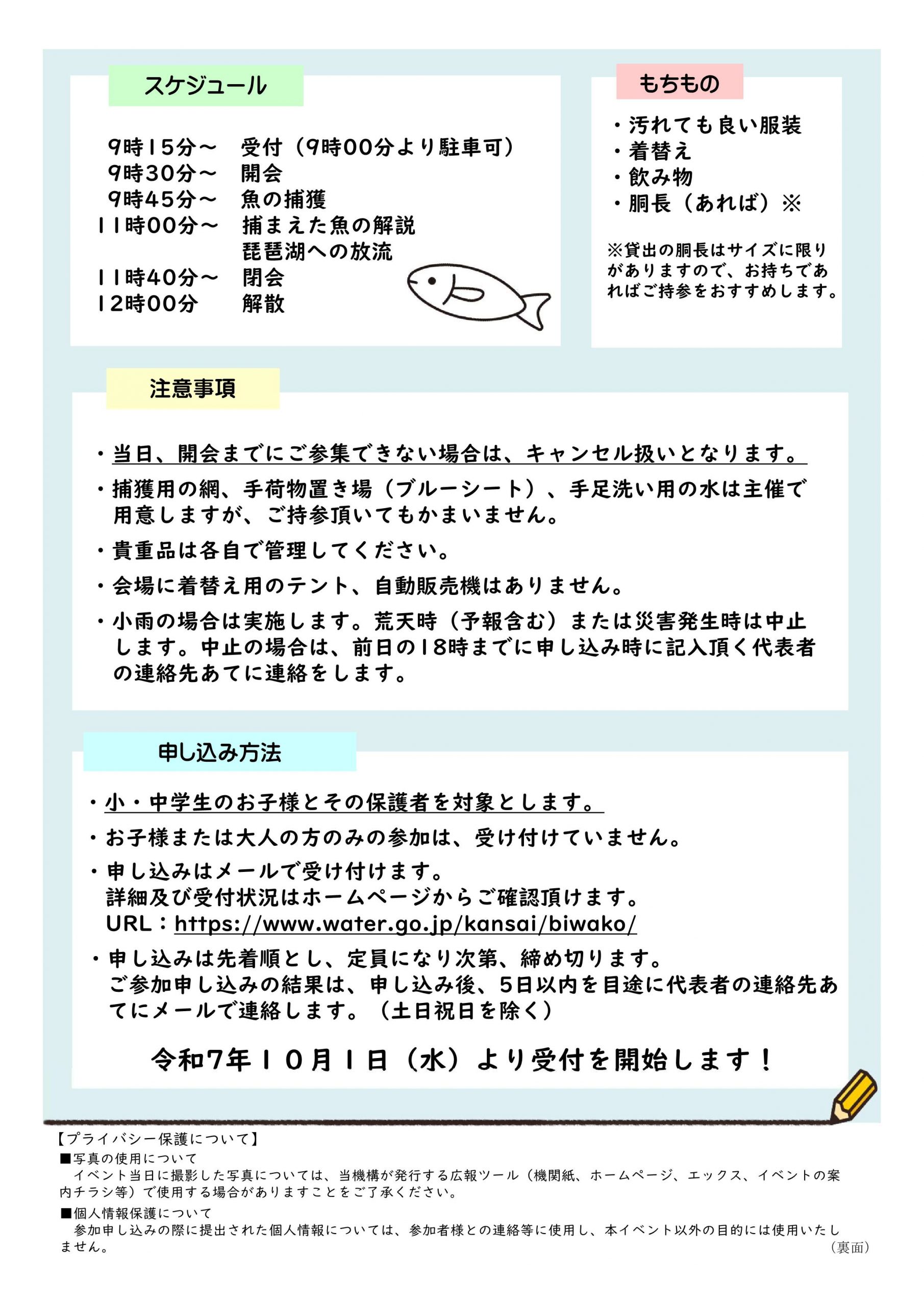 水資源機構 琵琶湖総合管理所では、琵琶湖の環境保全の取り組みの一環として、草津市新浜町にフナ・コイなどの在来魚の産卵・育成の場となるビオトープを設置しています。今年もビオトープ内の池の水を抜いて捕まえた魚を琵琶湖へ放流しましょう!詳しくは添付のチラシをご覧ください。ご応募お待ちしております!