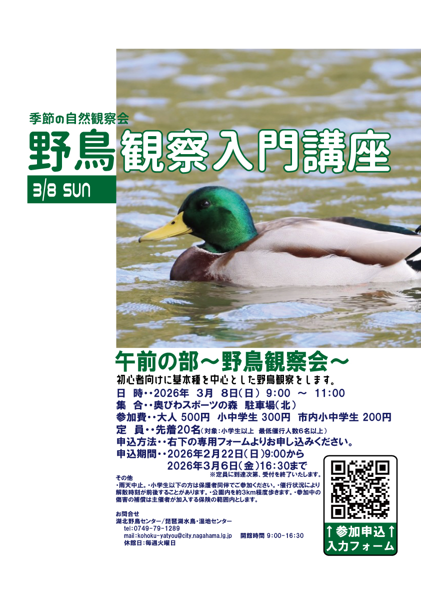 初心者向けに基本種を中心とした野鳥観察をします。 申込方法:チラシ右下の専用フォームよりお…