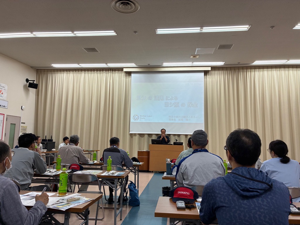 ダイハツ工業株式会社様には、環境保全活動事例を紹介していただき、工夫しながら活動しておられるのだと感じました。また、敷地内のビオトープの案内をしていただき、多くの生き物が生息していることと、保全のために、増えすぎたヨシを刈る必要があることを教えていただきました。滋賀県では保全されているヨシも増えすぎたら悪影響を及ぼすことを知りました。