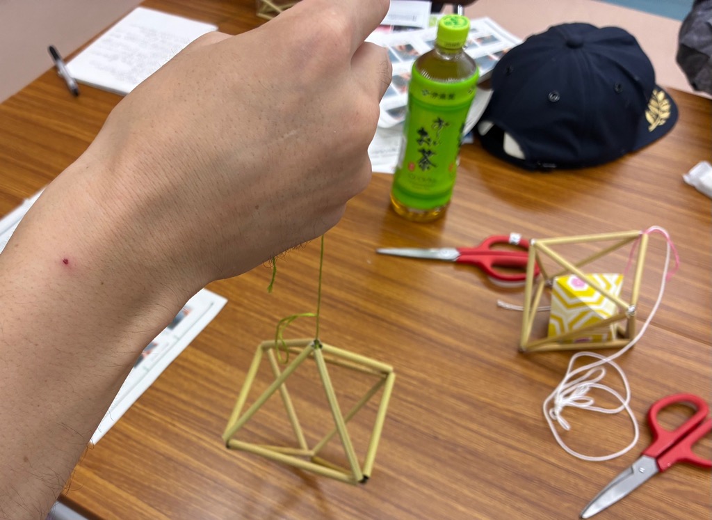 NPO法人まるよしの宮尾様にはヨシの保全に関するお話をしていただき、ヨシを使うことがヨシ滞の保全につながり、持続可能な形で保全活動を行うことの重要性を認識しました。ヨシを使った飾り(ヒンメリ)つくりについても教えていただき、子どもたちにただ作り方を伝えるのではなく、環境について意識してもらうための声掛けのコツなどを教えていただきました。