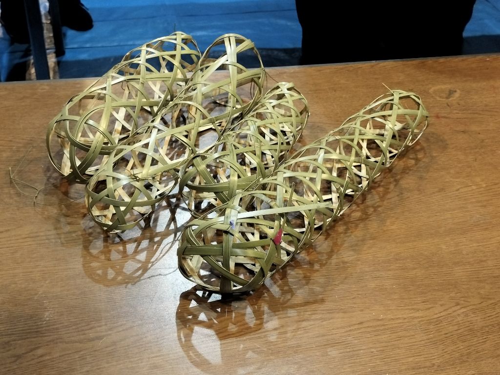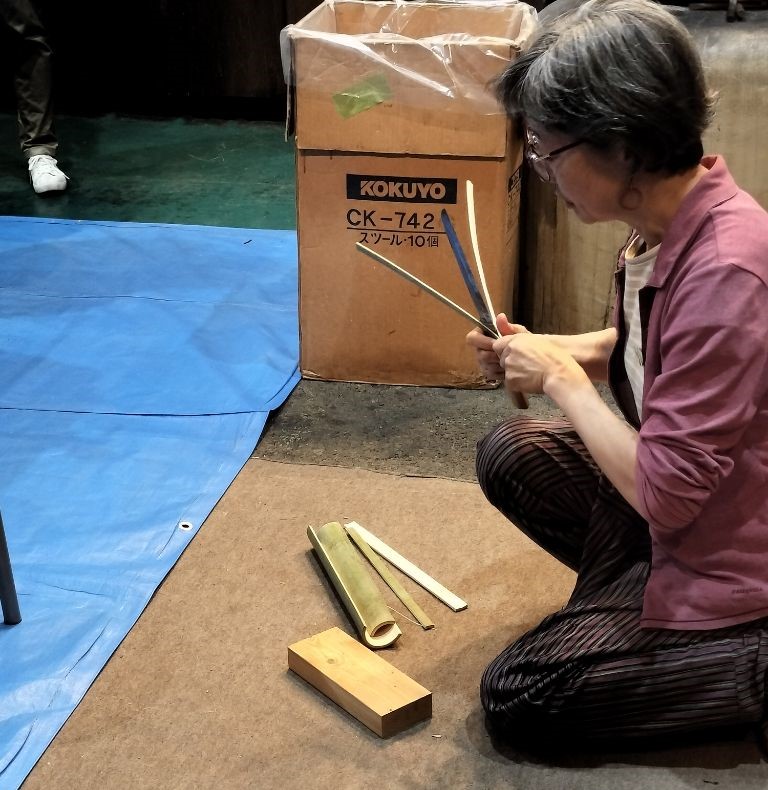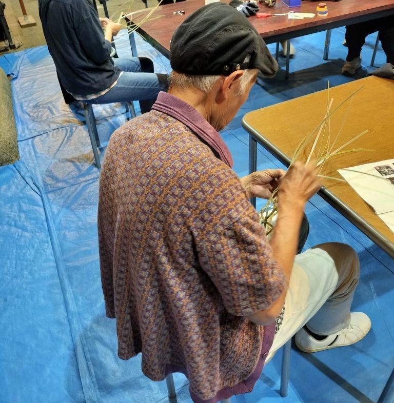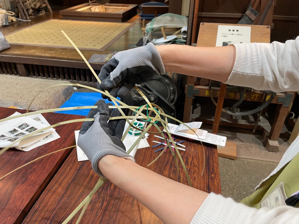 第二部は籠編みの講師から手ほどきを受けながらミニチュアサイズの蛇籠を実際に作りました。初心者に蛇籠編みはとても難しく、行きつ戻りつしつつもなんとか完成させることができました。今回のミニチュア用に講師の方が0.3㎜程の薄い竹を用意してくださり、一本の竹から厚さ0.3㎜程に薄く“へぐ”実演には感嘆の声が出ました。限りある材料を、多くのものに加工して使ってきた先人の智慧や工夫にも思いをはせることができました。多くの学びや考えるきっかけを得た講座となりました。