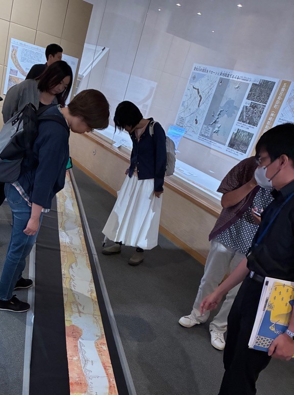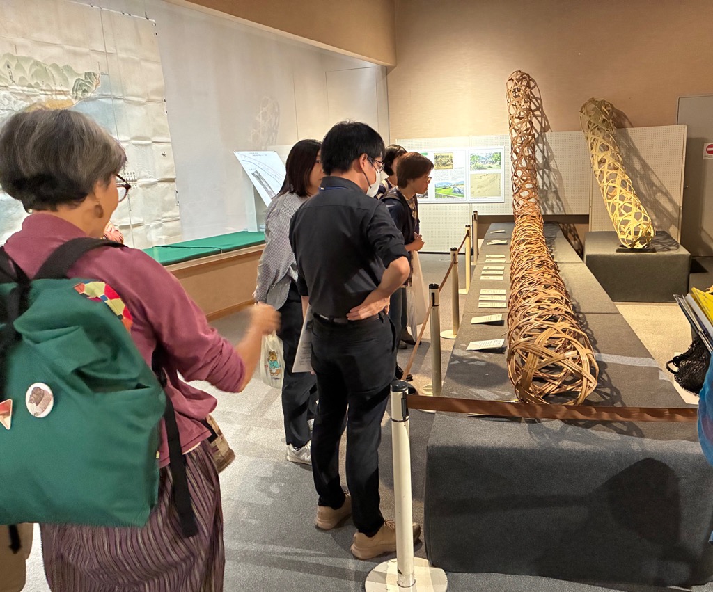 第一部は現在開催中の企画展示「川を描く、川をつくる」から“蛇籠”に注目し、治水に対する考え方や歴史的背景、蛇籠の機能などの講義を受けました。さらに解説を聞きながら展示資料の古地図や蛇籠を見学しました。記録されている智慧を紐解き、現代人に伝えていくという学芸員の仕事が印象に残りました。そしてその智慧は形を変えて現在にも生かされていることに驚きました。