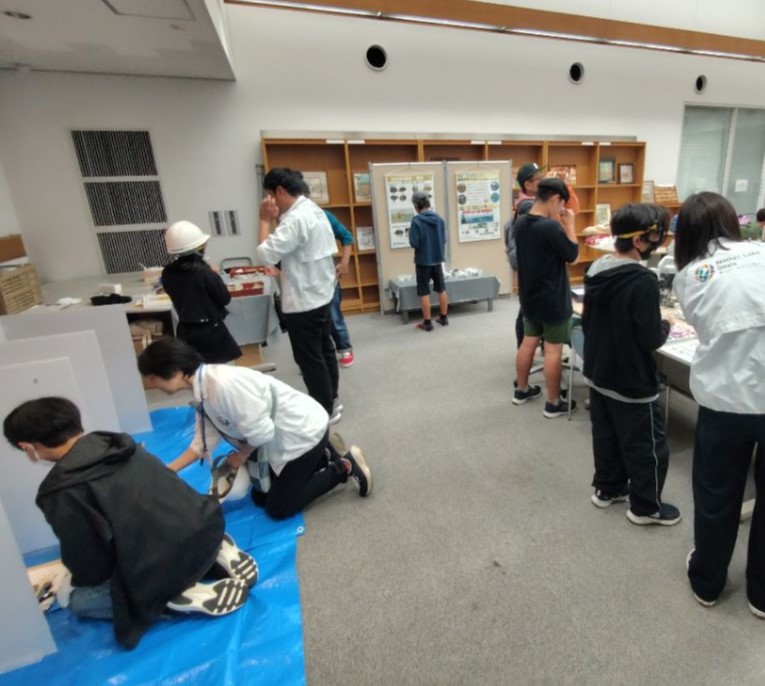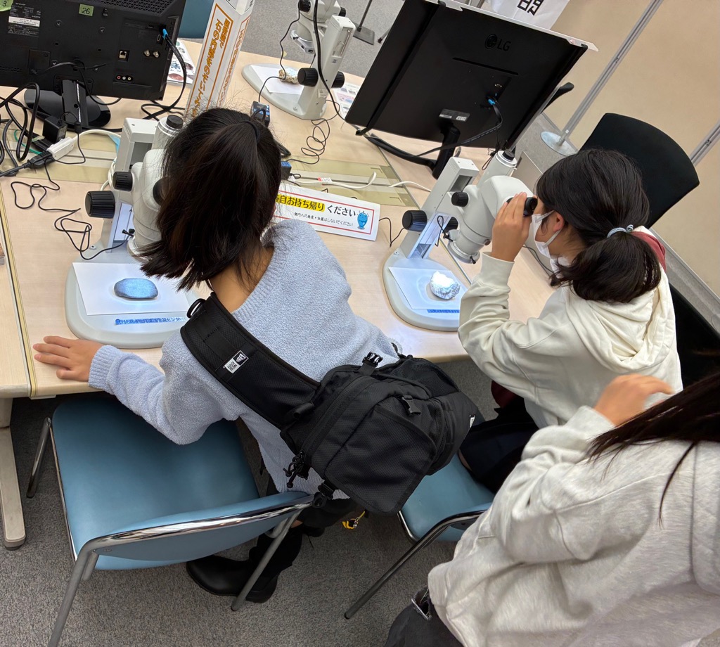 環境学習センターは11月9日(日)、ウォーターステーション琵琶・アクア琵琶で開催された第18回 水辺の匠に「顕微鏡で石の内部をのぞいてみよう」で出展しました!観察コーナーでは、花崗岩や砂岩、ホルンフェルスなどの滋賀県で採集した岩石9種類を顕微鏡やルーペで観察したり、ワークショップでは岩石ハンマーを使い実際に岩石を割る、という体験をしていただきました。観察コーナーでの人気は花崗岩!石英、長石、黒雲母などの鉱物の粒が見つけやすく参加された方は「写真を教科書で見たことあるけれど、実物はよりきらきらしていて綺麗だった」と話してくれました。