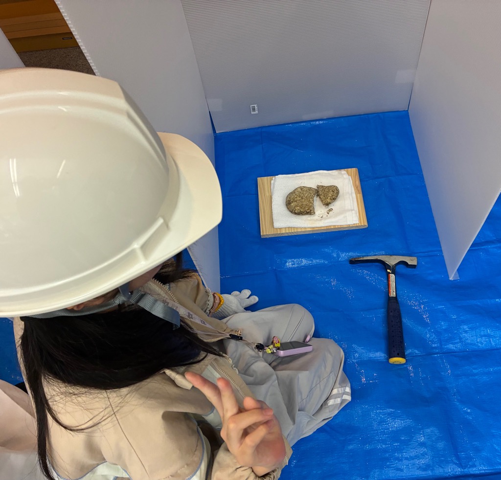 ワークショップでは、快音を響かせ早々に岩石を割る小学生の女の子もいて歓声が上がりました。