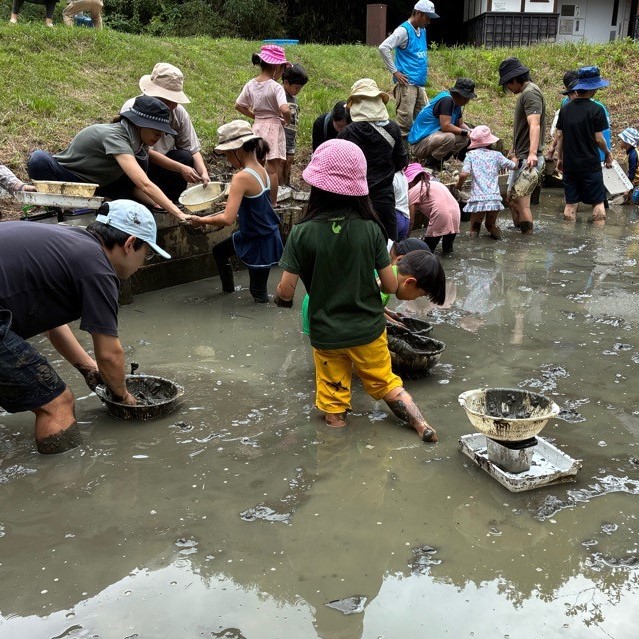 自分たちで泥上げした、ビオトープで生きもの探し中 |