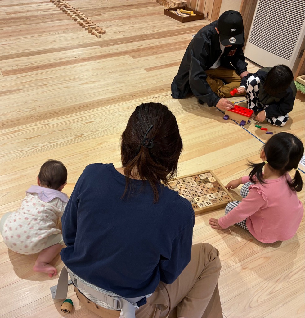| 訪れるのは2度目、歳の違う子たちも一緒にゆっくり遊べるところが魅力と話されていました。 上のお子さんはひらがなつみきに夢中 |